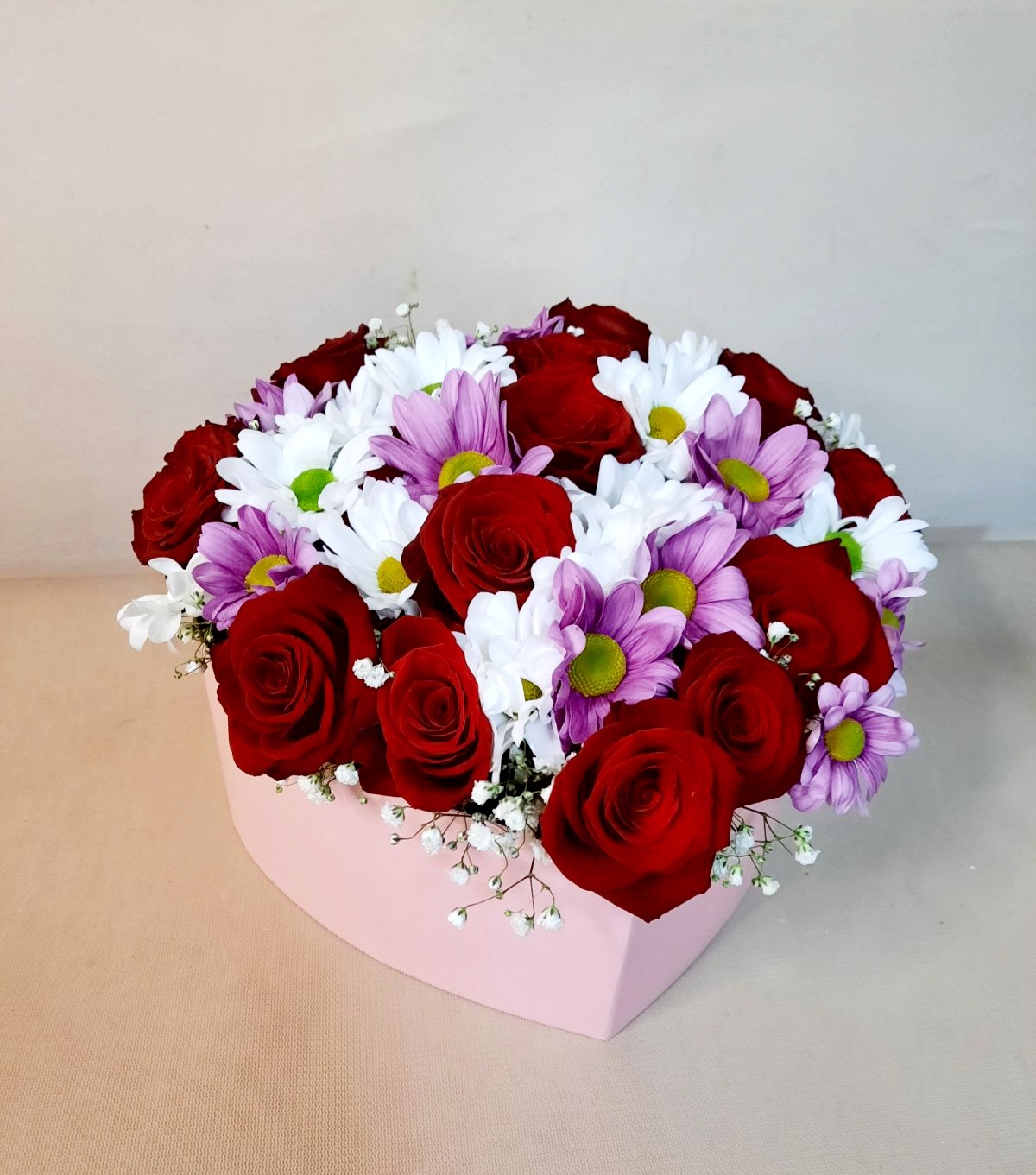 15 роз, 2 хризантемы, гипсофила