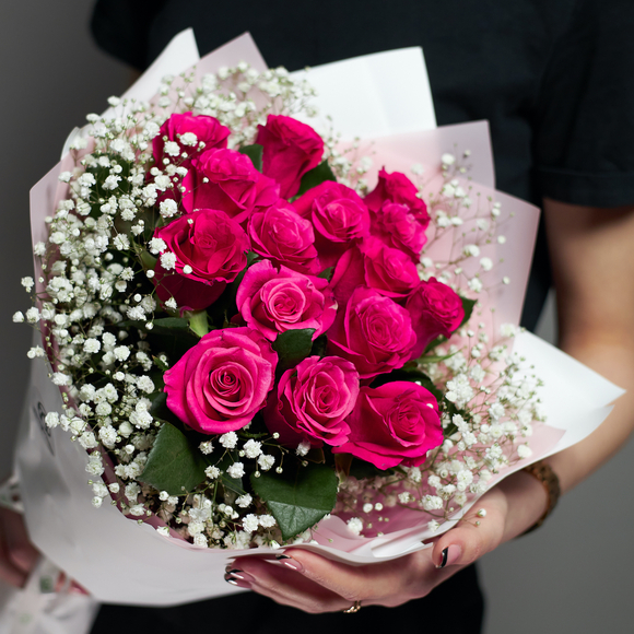 15 роз, 5 веток гипсофилы