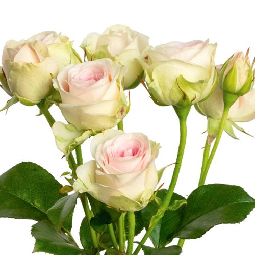 Ця гілкова троянда зачаровує з першого погляду. Її щільні бутони ніби створені для романтичної казки. Світло-молочний колір із кремовим підтоном надає відчуття витонченості, спокою й делікатності, а ніжно-рожеві серединки ніби створені для освідчень, дитячих свят і всіх тих моментів, коли важливе — світле й щире. Ця троянда — вибір для ніжних букетів: весільних, святкових, душевних. Вона виглядає розкішно як у моно-композиції, так і в поєднанні з півоніями, ранункулюсами чи дельфініумами.