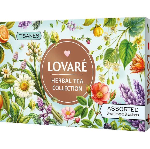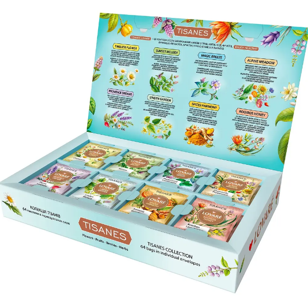 Колекція трав’яних чаїв Lovare Herbal Tea Collection – це 64 пакетики в індивідуальних конвертах з найяскравішим складом.